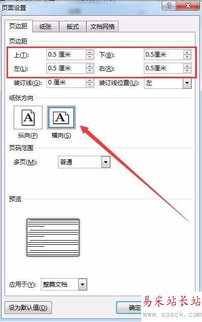 3、在頁面設置窗口中,我們把頁邊距設置為0.5厘米,然后調整紙張方向為橫向