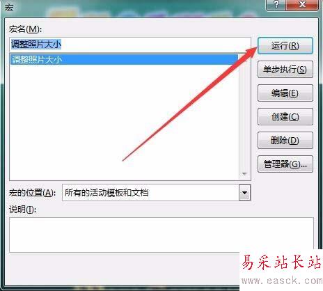 9、在打開的宏窗口中在左側窗口中選中剛剛創建的宏,點擊“運行”按鈕