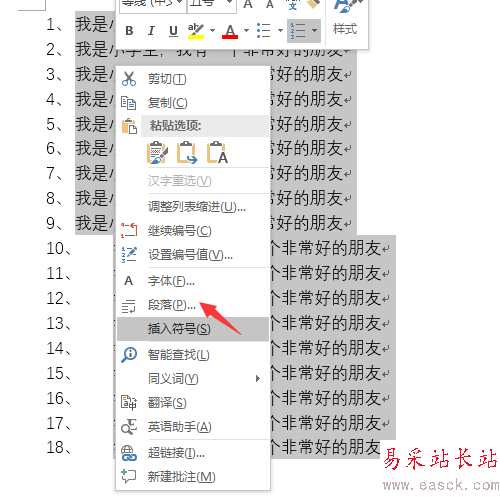 3、點擊鼠標右鍵。接著點擊鼠標右鍵,然后可以看到有一個段落的選項,就是需要通過這個段落選項來將內容進行編輯,這樣才能讓編號前面沒有空格,點擊段落選項。
