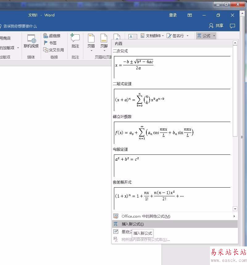 2、在【插入】菜單下最右邊選擇【公式】下拉列表——選擇【插入新公式】