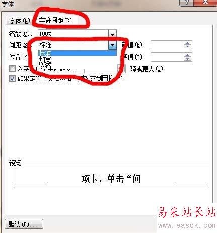 3、切換到“字符間距”選項卡,單擊“間距”右側的下三角按鈕,選擇“加寬”或者“緊縮”根據自己的需要選擇;