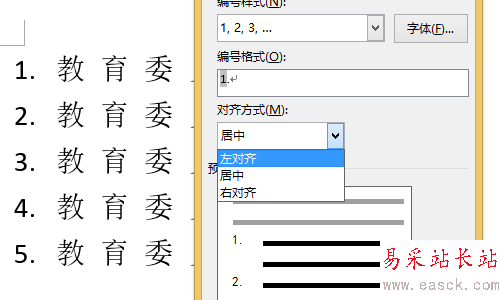 4、在彈出的窗口中你會發現如下圖所示的對其方式,在這里就可以消除編號與文字間的空格了,選擇左對齊