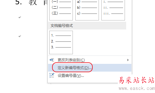 3、在打開的菜單頁面中找到下圖所示的“定義新編號格式”單擊調出屬性設置窗口