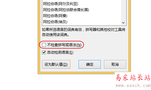 4、選好文字種類后,勾選下圖的”不檢查拼寫和語法(N)”并單擊如下圖的“社為默認值”按鈕,確定即可