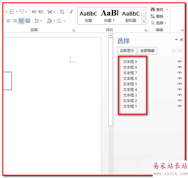 3、點“選擇窗格”后。下方彈出一個小窗口,窗口顯示所有文本框;如下圖所示。