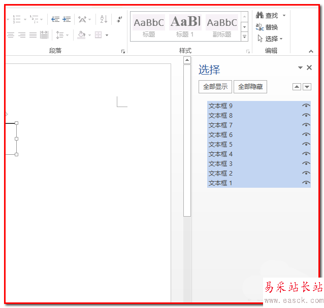 4、然后,左手按住鍵盤的CTRL鍵,右手點鼠標左鍵,把“文本框9到文本框1”逐一點下,就是連選了所有文本框。