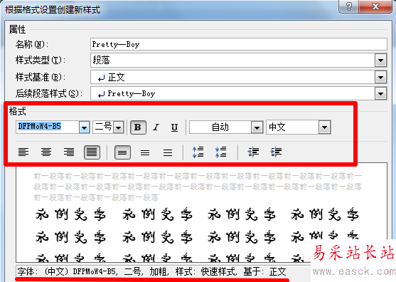 4、在下方的格式中可以設置word樣式的字體、字號、對齊方式以及行間距等等,在下方還會有文字提示新建word樣式的設置情況。