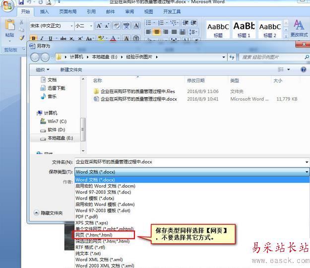 3、在【另存為】對話框下方【文件類型】處,選擇【網頁文件】。不要選擇其它文件類型。