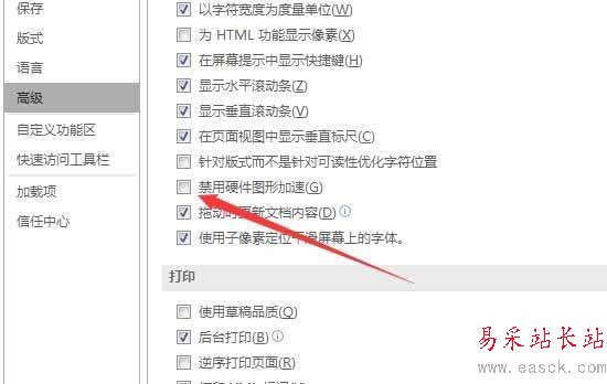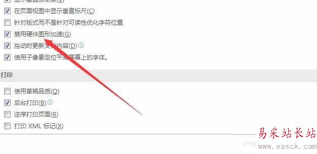 5、選中“禁用硬件圖形加速”前的復(fù)選框,最后點(diǎn)擊確定按鈕,重新啟動(dòng)word2016后,再滾動(dòng)鼠標(biāo)的時(shí)候,就不會(huì)出現(xiàn)文字閃動(dòng)的問(wèn)題了
