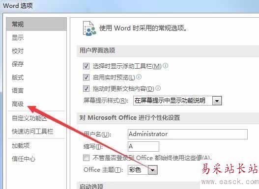 3、這時(shí)會(huì)自動(dòng)打開word選項(xiàng)窗口,點(diǎn)擊左側(cè)的“高級(jí)”側(cè)邊欄