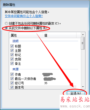 4、點擊選擇 從此文件中刪除以下屬性 ,并單擊 全選 按鈕,點擊 確定。