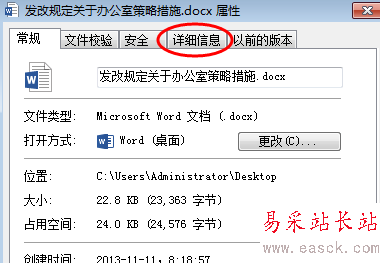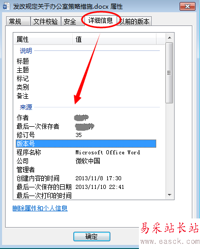 2、彈出 屬性 對話框后,點擊 詳細信息 選項卡,可以看到文檔的個人信息歷歷在目。