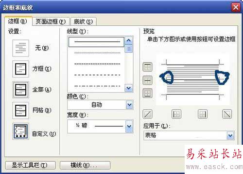 信紙是沒有左右邊線的,我們在表格上右擊選擇邊框和底紋。我們在右邊的那個示范表格的左右分別點一下這樣表格的左右邊線就不會顯示了。