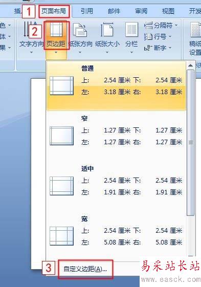 預定義邊距,【頁面布局】-【頁邊距】-【預定義邊距】。
