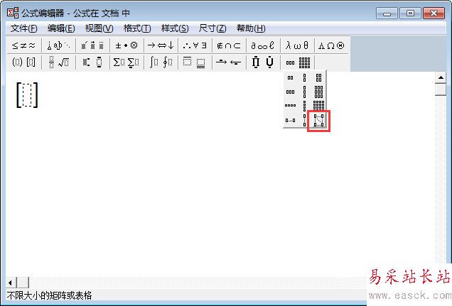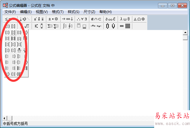 3、首先我們先插入矩陣外邊的括號(hào):這個(gè)相對(duì)簡(jiǎn)單,點(diǎn)擊如圖的位置即可