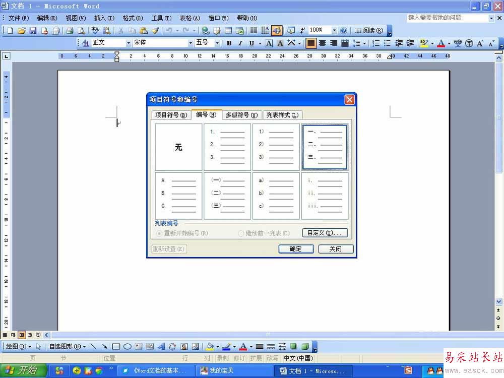 2、隨即出現“項目符號和編號”對話框,切換到“編號”欄,選中“一、二、三。。。。”如圖所示