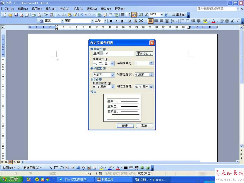3、點擊右下角的“自定義”,彈出“自定義編號列表”,在“編號格式”的“一”前面添加“星期”,“編號樣式”選為“一、二、三。。。”最后點擊“確定”如圖所示