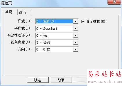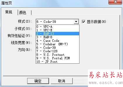 6、在常規選項卡, 我們可設置條形碼的樣式、子樣式,有效性驗證,線條寬度和方向, 我們可以通過下拉列表進行選擇;在右邊的“顯示數據”復選框中勾選或去掉勾可以設置條形碼中是否顯示數據;