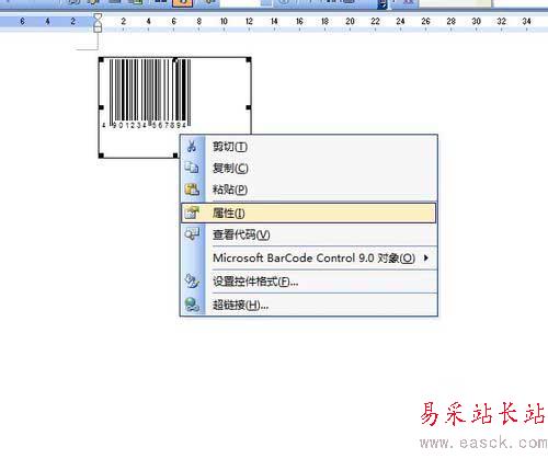 4、若要修改默認條形碼的樣式,條形碼的顏色和線條的寬度等內容, 我們可以右擊我們剛剛插入的條形碼圖標,從中找到屬性選項;如下圖;