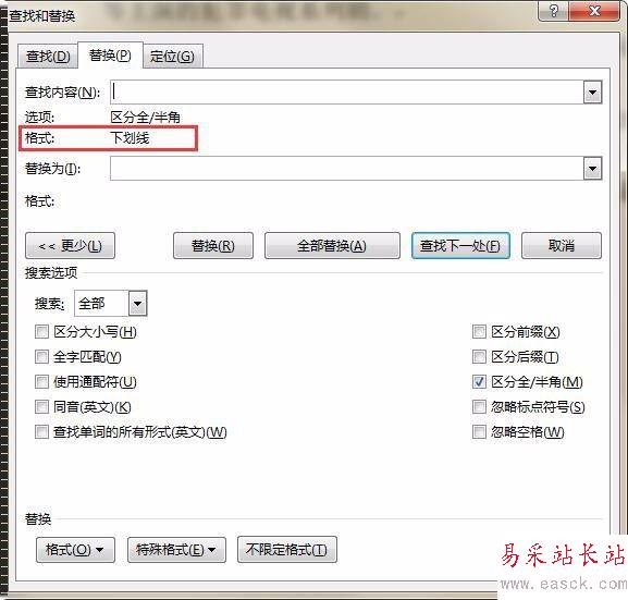 4、確定后,可以看到替換命令下多了一條對格式的限定條件“格式:下劃線”,說明設置成功。
