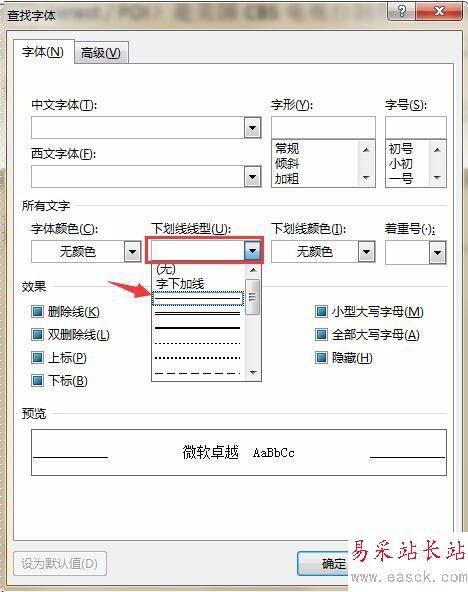 3、此時彈出字體窗口,找到【字體下劃線】的下拉選項,點擊下拉三角,選擇“字下加線”下面的單橫線的樣式。