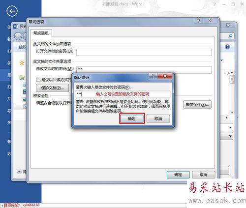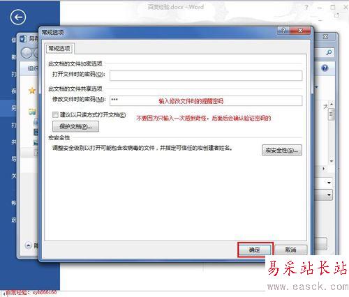 6、打開文件時的密碼保持空白,在“修改文件時的密碼”后面輸入我們要設(shè)置的密碼,然后點擊下面的“確定”按鈕