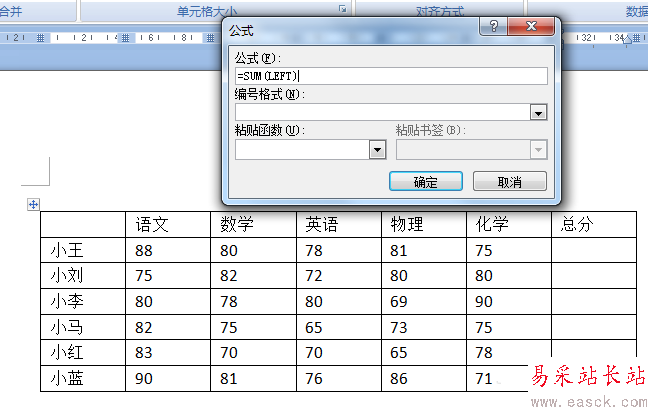 3、點擊打開公式窗口,進行相關內容的確認,如:數據源、求和函數等,單擊確定按鈕后,可以看到小王的總分就計算出來了;