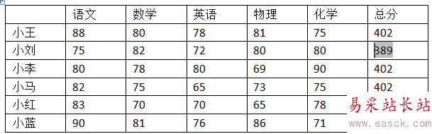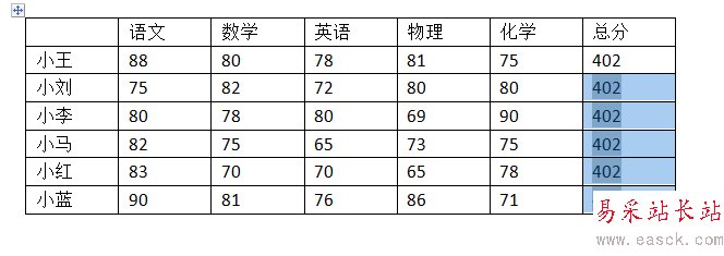 4、其他同學的總分我們可以通過一個簡便的辦法將其計算得出,我們將小王的總分進行復制,然后粘貼到其他同學的總分處;