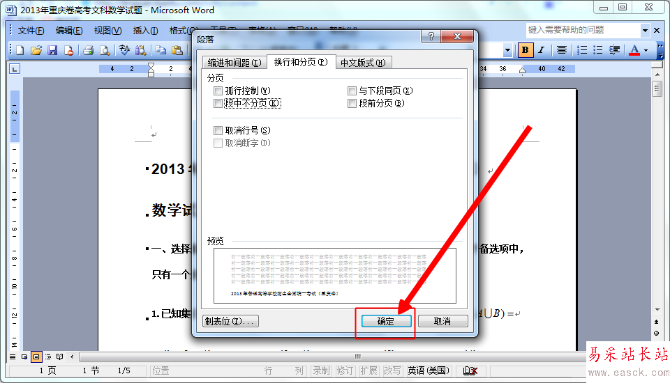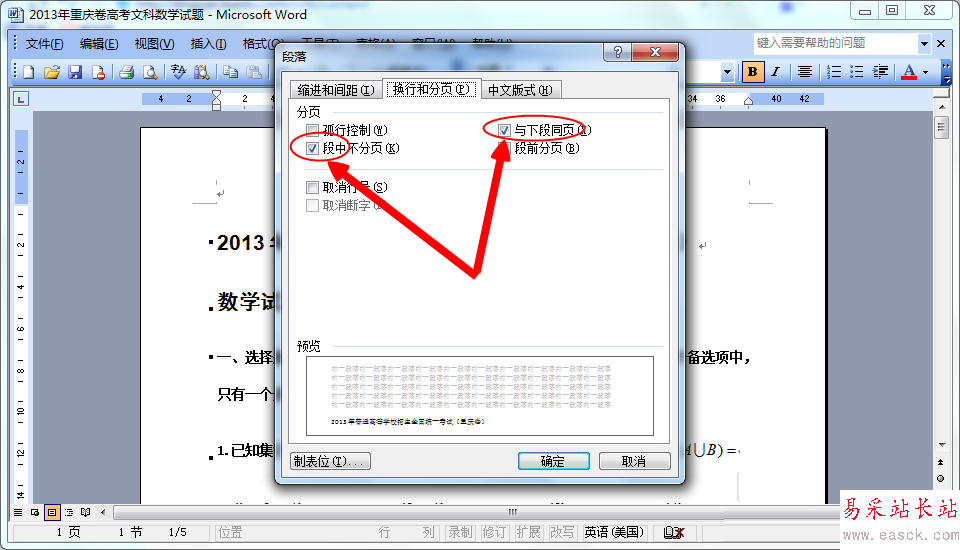 5、把“段中不分頁”和“與下段同頁”前的對勾,消除掉