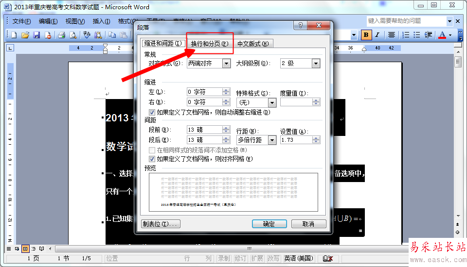 4、進入“段落”設置界面后,點擊正上方的“換行和分頁”