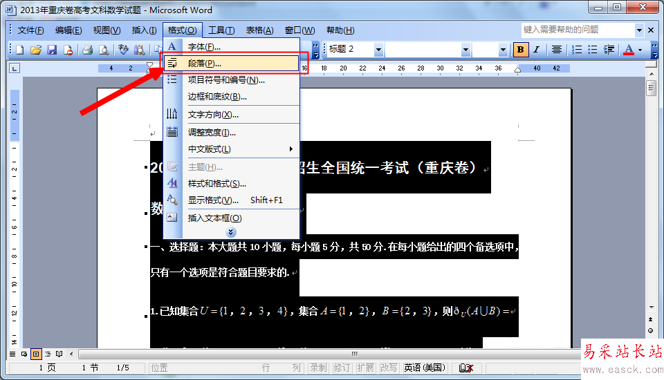 3、再在“格式”欄中找到“段落”,點擊選擇“段落”