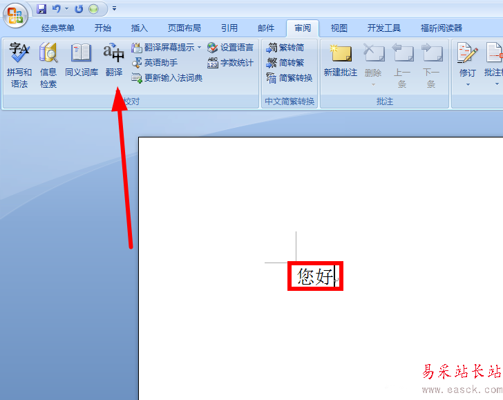 4、我們在切換到審閱之后,我們輸入我們的文字,然后我們點擊上邊的翻譯的選項卡