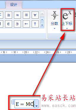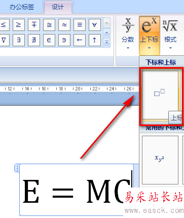 在方框內輸入文本“E=MC”,然后點擊【上下標】按鈕。
