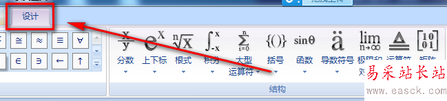 7、再看下功能區,將自動激活一個【設計】的選項卡,里面有各種公式輸入輔助工具。