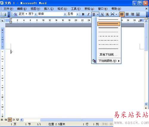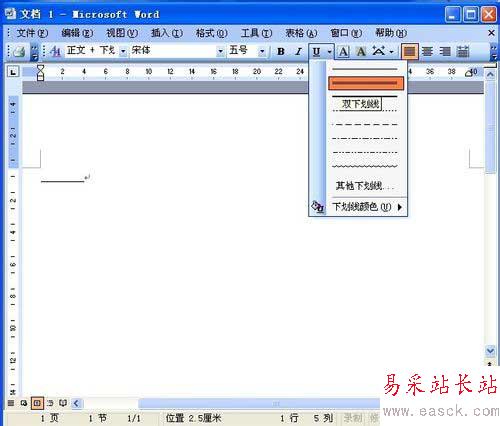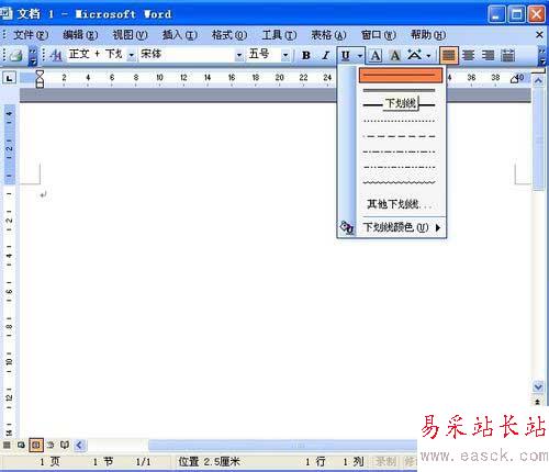 3、點擊下劃線按鈕U后面的箭頭以后出現下拉菜單,在下拉菜單上面點擊上面的下劃線