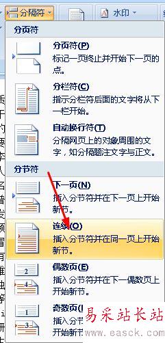 8、在下拉菜單中,選擇分節(jié)符中的連續(xù),如圖所示