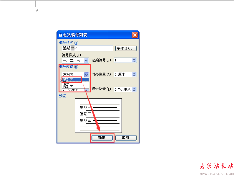 7、然后“編號(hào)位置”選擇“左對(duì)齊”,都選擇好之后點(diǎn)擊“確定”