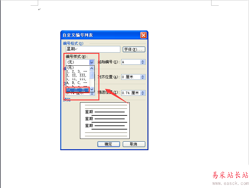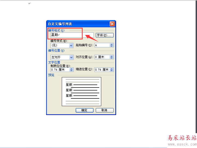 5、然后“編號(hào)格式”這個(gè)位置寫上“星期”
