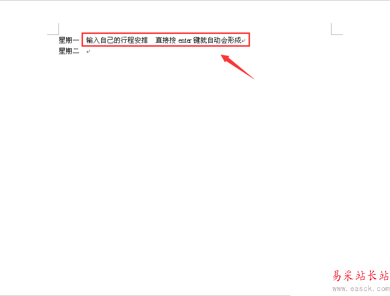 8、最后會(huì)自動(dòng)顯示星期一,然后輸入你自己對(duì)應(yīng)的行程安排,直接按enter鍵就會(huì)自動(dòng)形成星期二 ,以此類推