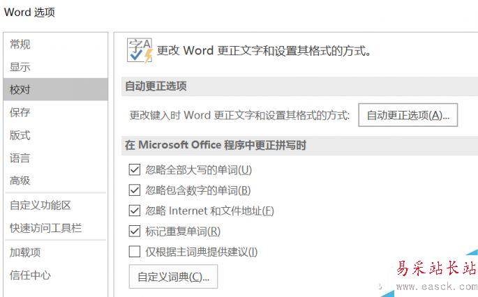 “Word選項(xiàng)中”切換到“校對(duì)”項(xiàng),并點(diǎn)擊“自動(dòng)更正選項(xiàng)”。