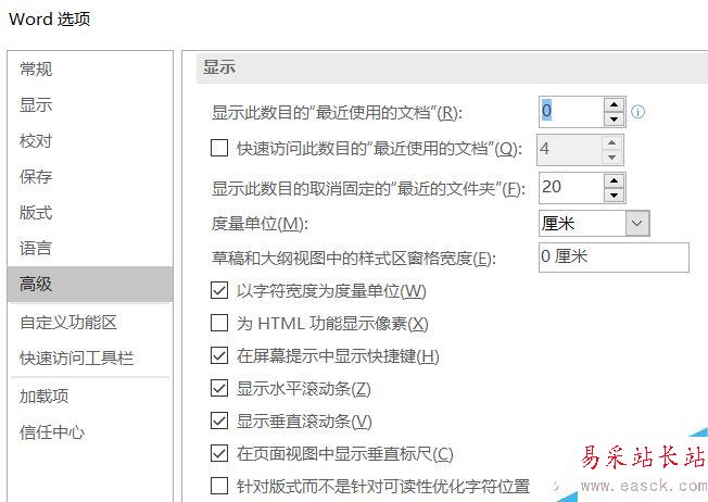 切換到“高級”項,下拉右側頁面,找到“顯示”項中的“顯示此數目的‘最近使用的文檔’”,將數值改為“0”。