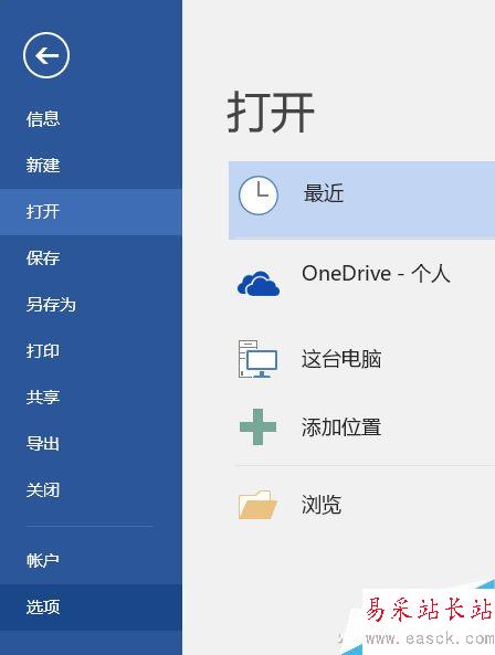 這個問題很好解決,點擊新建一個文檔,然后單擊“文件”選項卡,左側彈出菜單單擊“選項”。