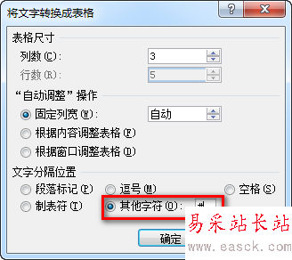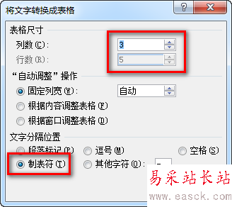 3、如果表格尺寸的列數(shù)不正確,手動(dòng)調(diào)整正確。本例就是3列的表格,分隔符是制表符。