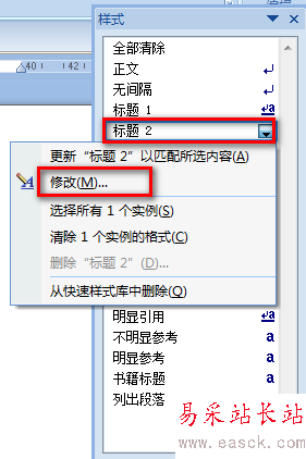 4、點擊【標題2】右方的下拉按鈕,選擇【修改】。