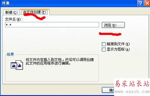 4、找到對象-由文件創建的功能,選擇瀏覽你要插入的文件。