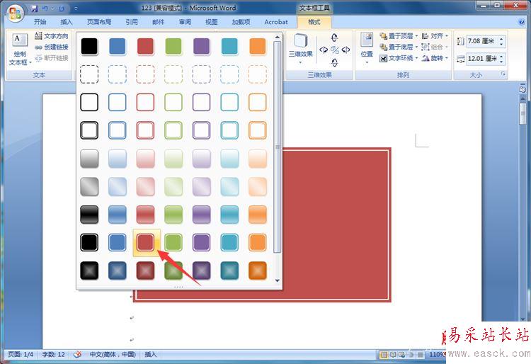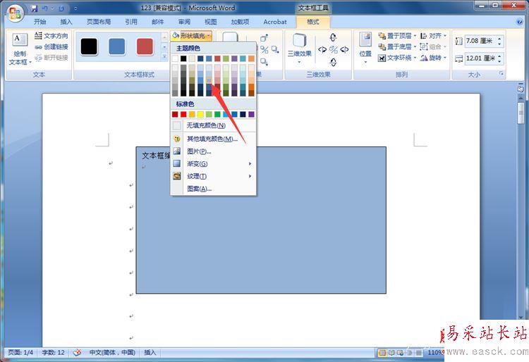 4、文本框顏色:word2007提供了豐富素材,點擊現成顏色樣式,也可以點擊形狀填充顏色。如圖所示