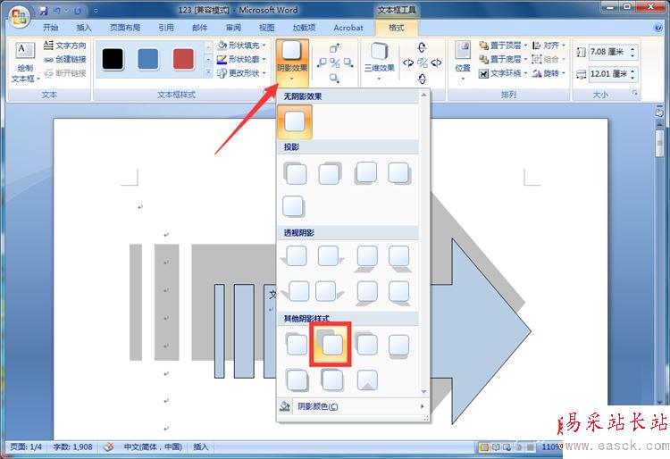 7、陰影效果:選擇文本框,點擊菜單陰影效果,增強文本展示空間感。如圖所示