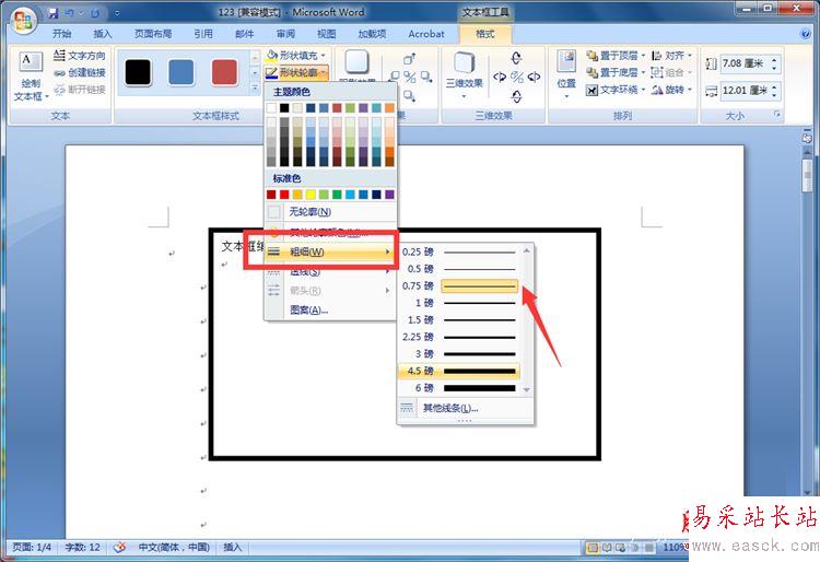 5、文本框形狀輪廓:點擊菜單形狀輪廓,調整輪廓線條粗細,虛線類型。如圖所示