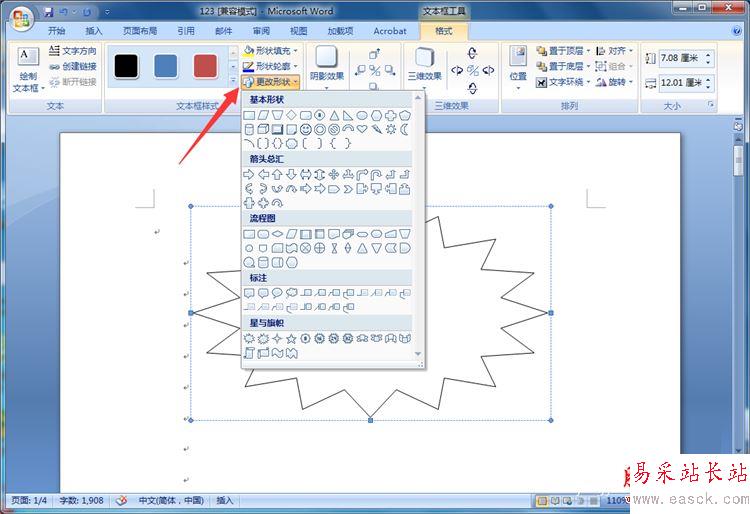 6、文本框形狀:通常情況我們只編輯文本內容,很少知道編輯文本框形狀。如果作為一篇文案演示,沒有PPT,我么也可以用word2007做出很好的展示效果。如圖所示