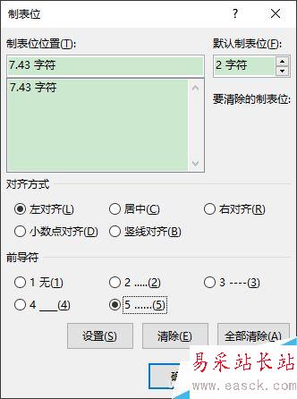 雙擊制表位標志可以打開它的設置對話框,在前導符欄中,選中第5項。